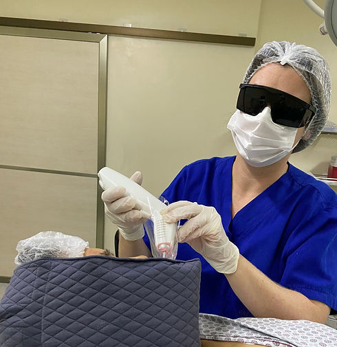 No atendimento é realizado a aplicação da bandagem de contensão cutânea, aplicação a crioterapia com temperatura controlada, aplicação de laser terapêutico intraoral e sistêmico (ILIB), que minimiza a formação do edema e reduz o processo inflamatório.